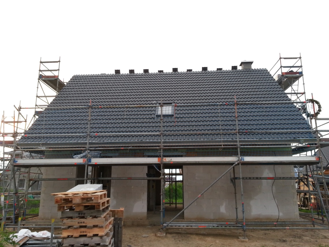 Dach... CheckVeröffentlicht am 01.06.2013 Das Dach ist soweit fertig. Es fehlen noch zwei Dachpfannen an der Außenseite aber das ist nichts Gravierendes. Das Dachflächenfenster auf der Nordseite hat nun auch seinen Platz gefunden. Die vorübergehenden Regenrinnenfallrohre wurden auch montiert. Die ersten Handgriffe im Garten sind auch schon erledigt. Es wurde ein Plätzchen für einen Geräteschuppen geschaffen. Dank eines fleißigen Helfers war das schnell erledigt.